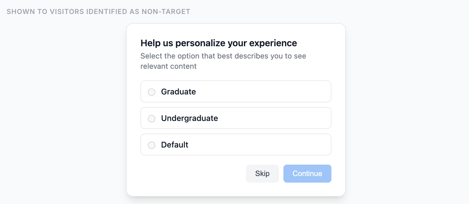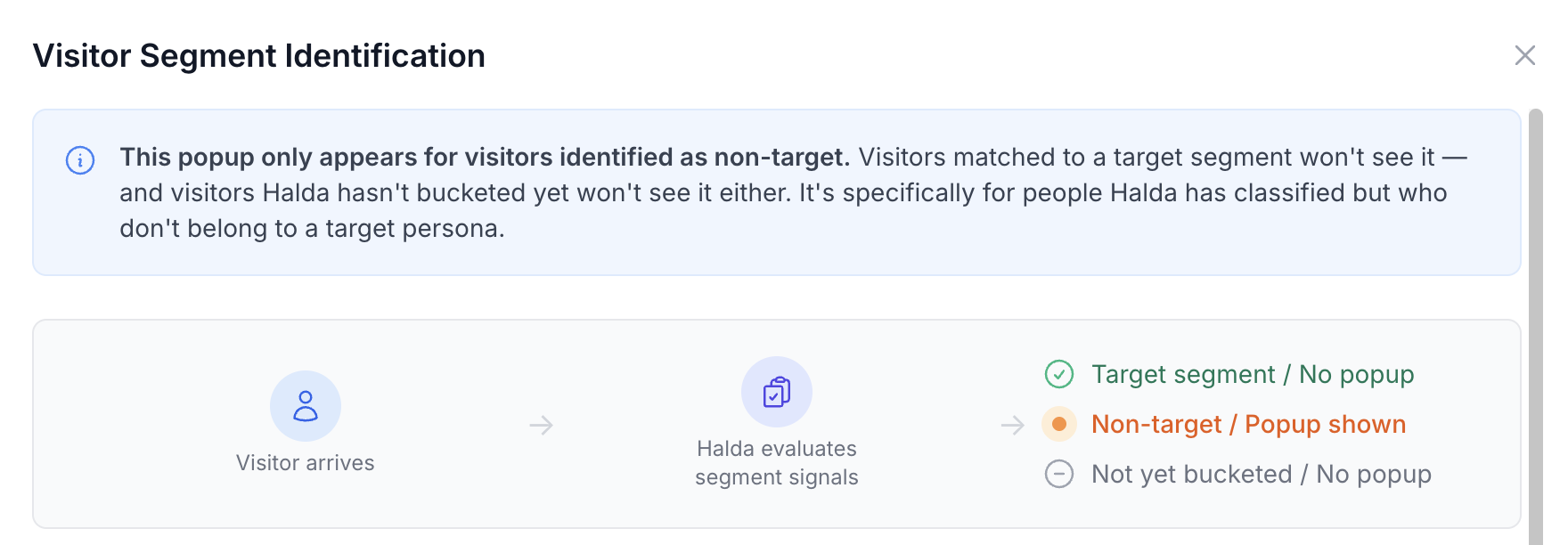 When a visitor doesn't match your target segments, Halda can show them a custom identification pop-up, hide forms and the hub entirely, and exclude them from your conversion metrics.
