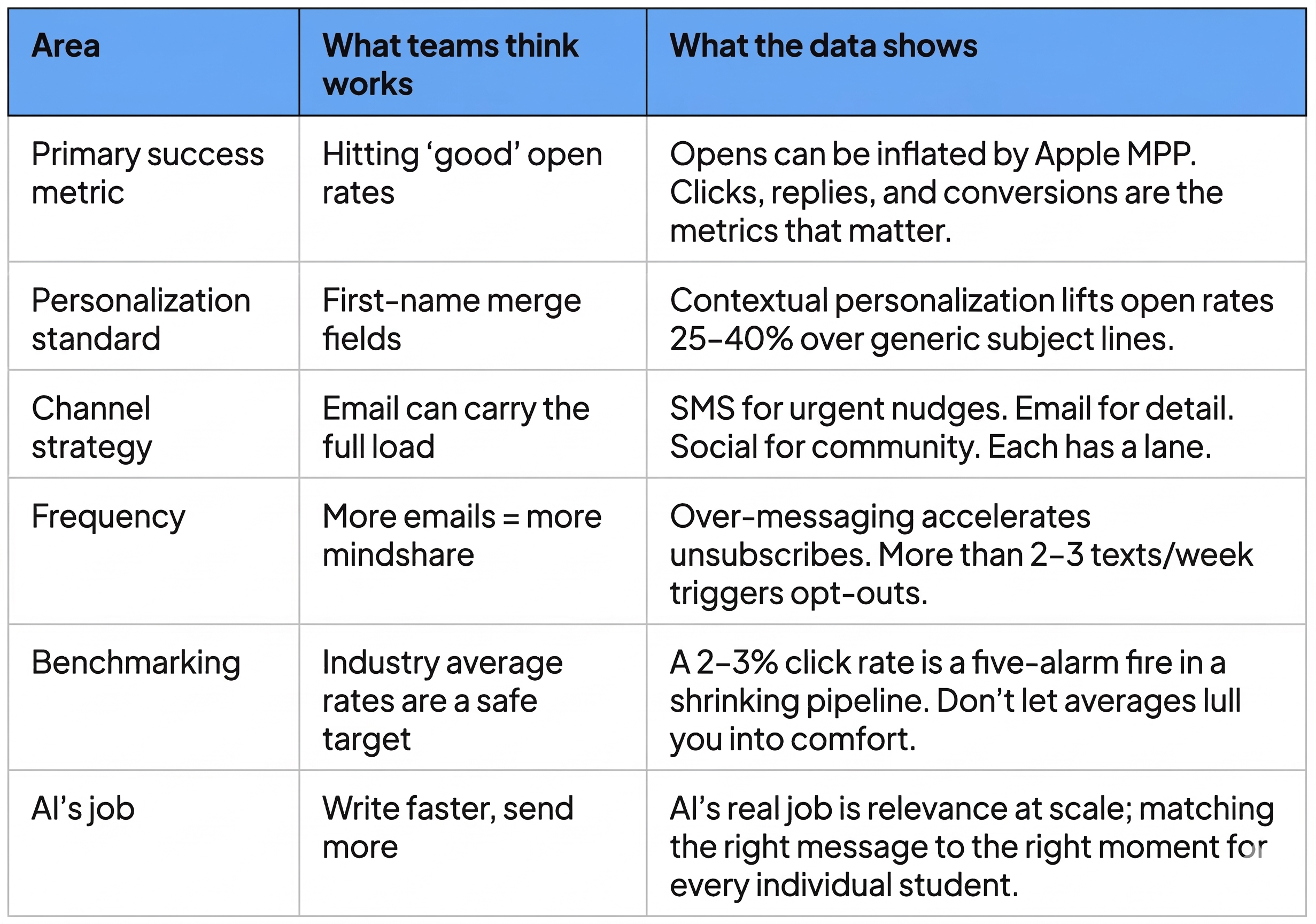 AI-assisted teams are still primarily optimizing subject lines for open rates. Given what we know about MPP inflation, this means teams are training AI on an imperfect signal. The model gets better and better at driving a metric that doesn't reflect student behavior.